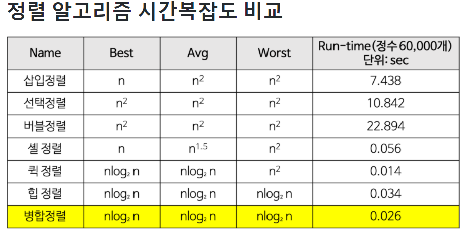 병합정렬의 장점으로는 시간복잡도가 O(nlogn)으로 굉장히 효율적인 코드이다. 단점으로는 temp[ ]라는 공간을 차지하는 배열을 만들어야한다는 점이다.