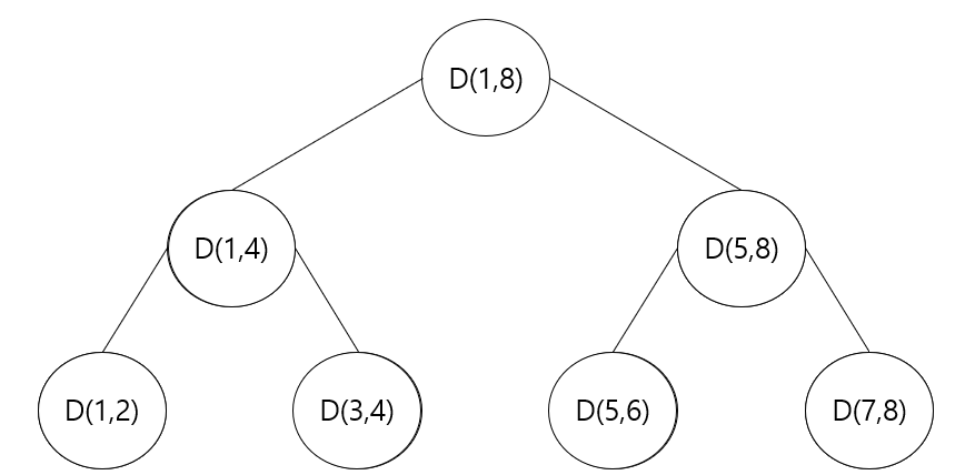 정렬은 D(1,2) - D(3,4) - D(1,4) - D(5,6) - D(7,8) - D(5,8) - D(1,8)의 순서로 실행이 된다. (후위 순회)